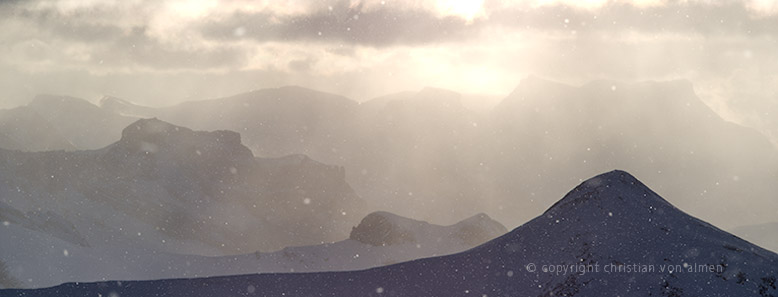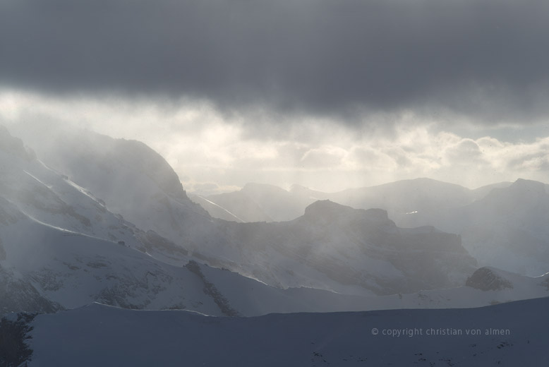 Wie schon so oft in diesem Winter bläst ein starker Wind von Westen. Er treibt die Schneefahnen in wilder, zügelloser Jagd vor sich her, hetzt sie entlang den Bergrücken, durch Felslücken und über die Grate hinweg und lässt erst, weit draussen in den Leeseiten von ihnen ab. Dort rieselt der Schnee auf die Hänge, verfestigt sich zu einer kompakten Schicht. Der Fachbegriff für dieses grossartige Schauspiel heisst Schneeverfrachtungen. Eine der heimtückischsten Ursachen für Lawinenabgänge für den Skitourenfahrer. Besonders dann, wenn sich dieser verfrachtete Schnee unter einer herrlich leichten Pulverschneedecke " versteckt". Obwohl mich das im Augenblick wenig kümmert, hefte ich mir diesbezüglich eine grosse Notiz an meine Gedächtnis-Pinnwand.