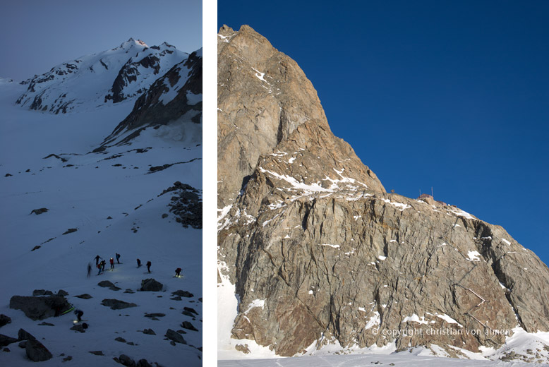 Noch ist es fast Nacht. Die ersten Alpinisten machen sich, unten beim Skidepot der Hütte, für einen weiteren Traumtag bereit. Am Gipfel des Trugbärgs lassen sich die ersten Vorboten des Tages nieder.Die Konkordiahütte steht auf einer breiten Felsschulter, aus welcher der Westgrat des Fulbärgs gipfelwärts strebt. Die erste Hütte wurde bereits 1877 gebaut. Damals stand sie knapp 50 Meter über dem Gletscher. Heute sind es mehr als 150 Meter!