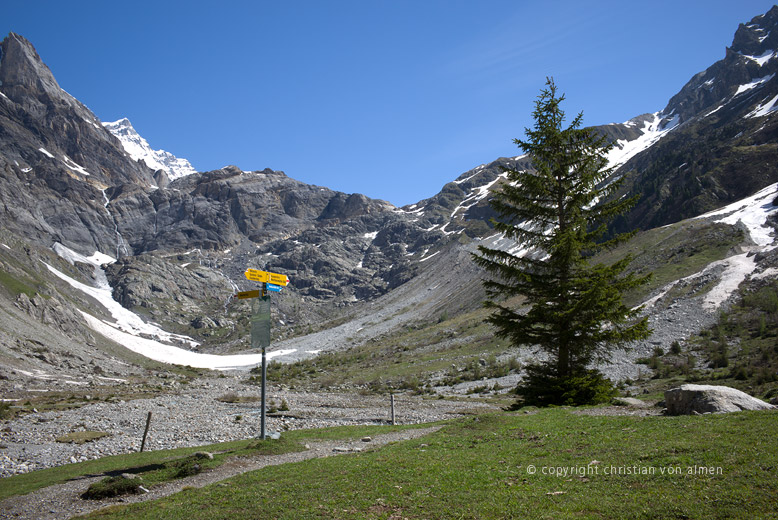 Wenn wir fast zuhinterst im Gasterntal, bei Selden, gegen den Lötschenpass hoch steigen, der ins Lötschental hinüber führt, erreichen wir nach knapp einer Stunde auf einem hübschen Weg, unter schattenspendenden Tannen und Lärchen hindurch die Alp. Von hier öffnet sich ein fantastischer Blick hoch zum Doldenhorn und auf den hinteren Talabschluss mit dem kaum noch sichtbaren Kanderfirn. Letzterer bildet den Zugang zu den Gletscherpassübergängen ins Lauterbrunnen- und Kiental. Derjenige ins Lauterbrunnental ist besonders zu empfehlen.