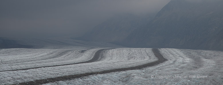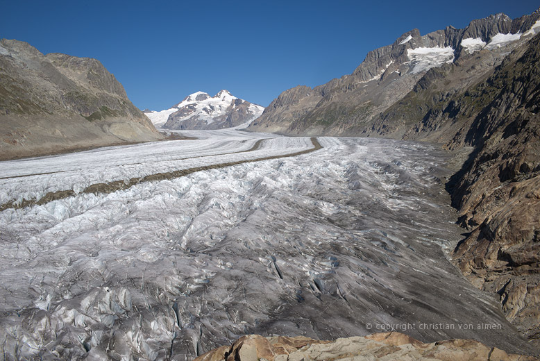 Vor Jahrtausenden durchbrach hier ein Seitenarm des Grossen Aletschgletschers die damalige Bergkette zwischen Strahl- und Eggishorn. Der mächtige Eisstrom schürfte Richtung Fiesch, unermüdlich ein Tal von fast 700 Meter Tiefe in dem harten Gneis. Heute ist das Strahlhorn das südliche Ende der Wannenhornkette. Diese nimmt ihren Anfang am Fulbärg, fast acht Kilometer Aletschgletscher aufwärts, oben am Konkordiaplatz. Am Eggishorn beginnt die neue Bergkette. Sie verläuft parallel zum Aletschgletscher, über das Bettmerhorn bis hinunter zur Riederfurka – Distanz um die sieben Kilometer. Zählt man die beiden Strecken zusammen und addiert noch den Abschnitt vom Konkordiaplatz bis zum Jungfraujoch, ergibt das eine Gesamtgletscherlänge von rund 23 Kilometern. Längere Eisströme gibt es in Europa nur noch ausserhalb der Alpen.
