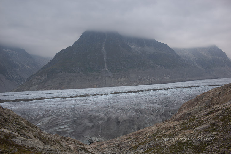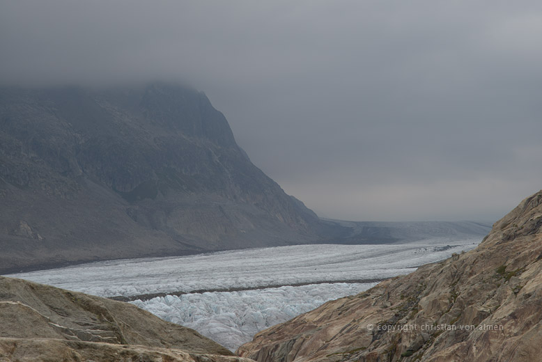 Bei der Gletscherstube - ein treffender Name für den Ort, wo früher der Gletscher im engen Tal lag, eben in einer Stube - fühlt sich der Blick von den felsenschweren Bergketten links und rechts bedrängt. So sucht er sich den freien Weg nach vorne dem Gletscher zu, welcher hier mit einer Geschwindigkeit von 180 Meter pro Jahr vorbeifliesst. Doch bereits nach eineinhalb Kilometern fängt der behäbige Bergkoloss Olmenhorn den Blick auf, an dessen Fuss früher ein Sommersiedelung lag. So wendet man sich wieder der Talmulde zu. Diese senkt sich von der Gletscherstube in sanft abgestuften Geländeabschnitten gegen den Grossen Aletschgletscher. In den dazwischen liegenden Ebenen schmiegen sich viele kleine Seen in die nachglaziale Landschaft. Anmutig und lieblich liegen sie eingebettet zwischen grösseren und kleineren Moos- und Feuchtgrasflächen. Um sie herum wachsen Gletscherweiden, Säuerlinge, verschiedene Steinbrecharten, Fleischers Weidenröschen und viele andere Pionierpflanzen mehr. Die junge Grasnarbe dazwischen, kaum Hundert Jahre alt, wirkt noch sehr verletzlich. Überall schauen Steine heraus, die von der Vegetation erst zum Teil überwachsen sind. Diese benutze ich beim Gehen als Brücke, um den Boden nicht unnötig zu verletzen.