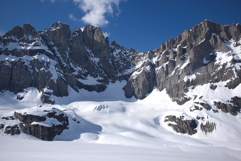 Viel zu schnell erreiche ich den Tschingelfirn. Grossartige, ein wenig bedrohliche, brodelnde Wolkenstimmungen über dem Mutthorn und der Blüemlisalpgruppe hinter mir. Darüber die tiefstehende Sonne. Warm leuchten die Felsen der Südwand des Gspaltenhorns im späten Nachmittagslicht. Schön, wie sie sich aus dem makellosen Weiss des Firnfusses in den Abendhimmel hoch steilt. Talauswärts, den Blick eingerahmt vom Südgrat des Tschingelrates, respektive von demjenigen des Nordgrates der Kanzel. Zwischen dem Rahmen die monumentale Kulisse der Nordwände des hinteren Lauterbrunnentals. Ein riesiges, hochalpines Gemälde.