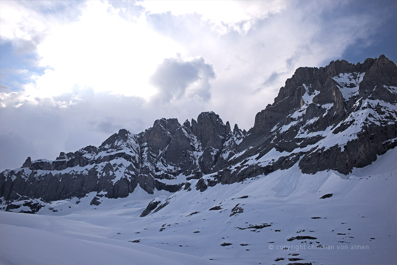Ich setze mich auf einen ausgeschmolzenen Stein, geniesse hungrig das arg verspätete Mittagessen, folge mit meinem Blick dem, auf den Bergflanken nach oben wandernden, Sonnelicht, betrachte die starke Höhenströmung im Himmel. Berate mich mit mir selber. Wird es noch - quasi als Zugabe - ein Abendrot geben? Der schnelle Wolkenaufzug von Westen spricht dagegen. So setze ich meine Abfahrt fort.