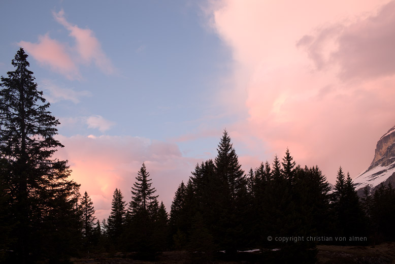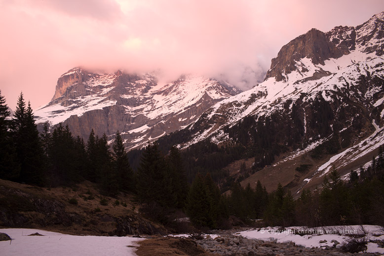Weiter unten überquere ich die Ebene des Oberhornsees, folge dem Weg Richtung Schmadrihütte. Doch anstatt aufzusteigen, nehme ich ein gut ausgeprägtes, breites Bergweidenband, traversiere leicht abfallend den anschliessenden, steilen Hang hinüber zum Schmadribach. Nur noch gerade heute reicht es, diesen auf einer eher zweifelhaften Schneebrücke zu passieren. Anstatt hinüber zur Breitlauenenalp, die schon schneefrei ist, fahre ich, immer der Nase nach, direkt zum Läger ab. Bis zum letzten Absatz vor dem Boden geht auch alles gut. Dummerweise entscheide ich mich dort taleinwärts abzusteigen. Wieder meinem ersten Impuls folgend, es talauswärts zu versuchen. Nach einer halben Stunde Hindernislauf durch den wilden Bergurwald sowie einem Skischuh voll Wasser, erreiche ich schlussendlich, etwas genervt, den Wanderweg. Gerade rechtzeitig für die letzten Bilder vom fahlen Abendrot über den Bergspitzen. Das vergängliche, zarte altrosa Licht versöhnt mich mit meinem Missgeschick.