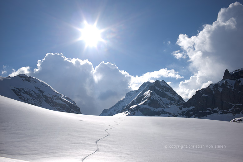 Stehen, staunen, die Landschaft mit allen Sinnen aufnehmen, spüren und erfahren. Felle abziehen, im Rucksack verstauen, ein Schluck Tee, ein letzter Blick hinüber zum Bietschhorn. Mit kräftigen Stockstössen traversiere ich unter den Südwestgrat des Tschingelhorns, folge einer Mulde die sich hinunter zu den ersten, obersten Hängen senkt, male meine Spur in grossen, weitgezogenen Kurven auf die jungfräulichen Schneehänge. Momente der absoluten Leichtigkeit des Seins, sorglos, beinahe schwerelos, ganz im Hier und Jetzt.