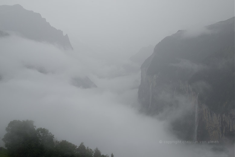 Der Tag hat sich schon lange über die Berge davon gemacht und mich mit der Dunkelheit der Nacht zurück gelassen. Mein linkes Knie schmerzt. Die beiden Hüftgelenke sind komplett verkrampft, fühlt sich wie Muskelkater an. Jeder Schritt wird darob zu einer Anstrengung. Bin froh, mich bei meinem Abstieg für den, entlang der Weisse Lütschine, rechtsufrigen Weg entschieden zu haben, der linksufrige führt über tausend Tritte hinunter ins Tal. Die Finsternis ist angefüllt mit dem mächtigen Rauschen der wilden Wasser tief unter mir.