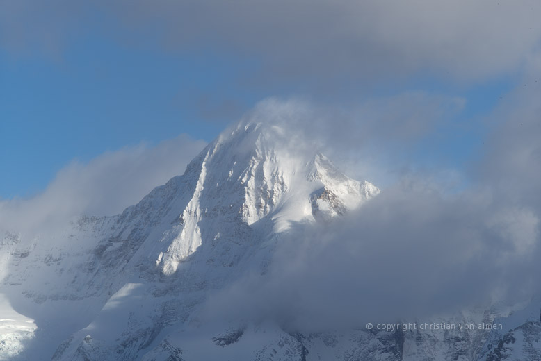 Seit ein paar Tagen liegen die Täler unter einer kompakten dunkelgrauen Bisnebelschicht. Schwer wie ein Betondeckel lastet sie auf Gemüt und Landschaft. Selbst tagsüber brennt das Licht meiner Lampe auf dem Arbeitstisch. Doch dann endlich, an einem späten Morgen, schimmert ein zaghaftes Weiss durch die trübe Wetterbrühe. Schnell sind meine sieben Sachen gepackt. Eine knappe Stunde später stehe ich in Stechelberg bei der Talstation der Schilthornbahn. Hier mischt sich bereits etwas Himmelsblau mit dem Grau des Nebels. Ein untrügliches Zeichen, dass, ein paar hundert Höhenmeter über mir, die Sonne scheinen wird.